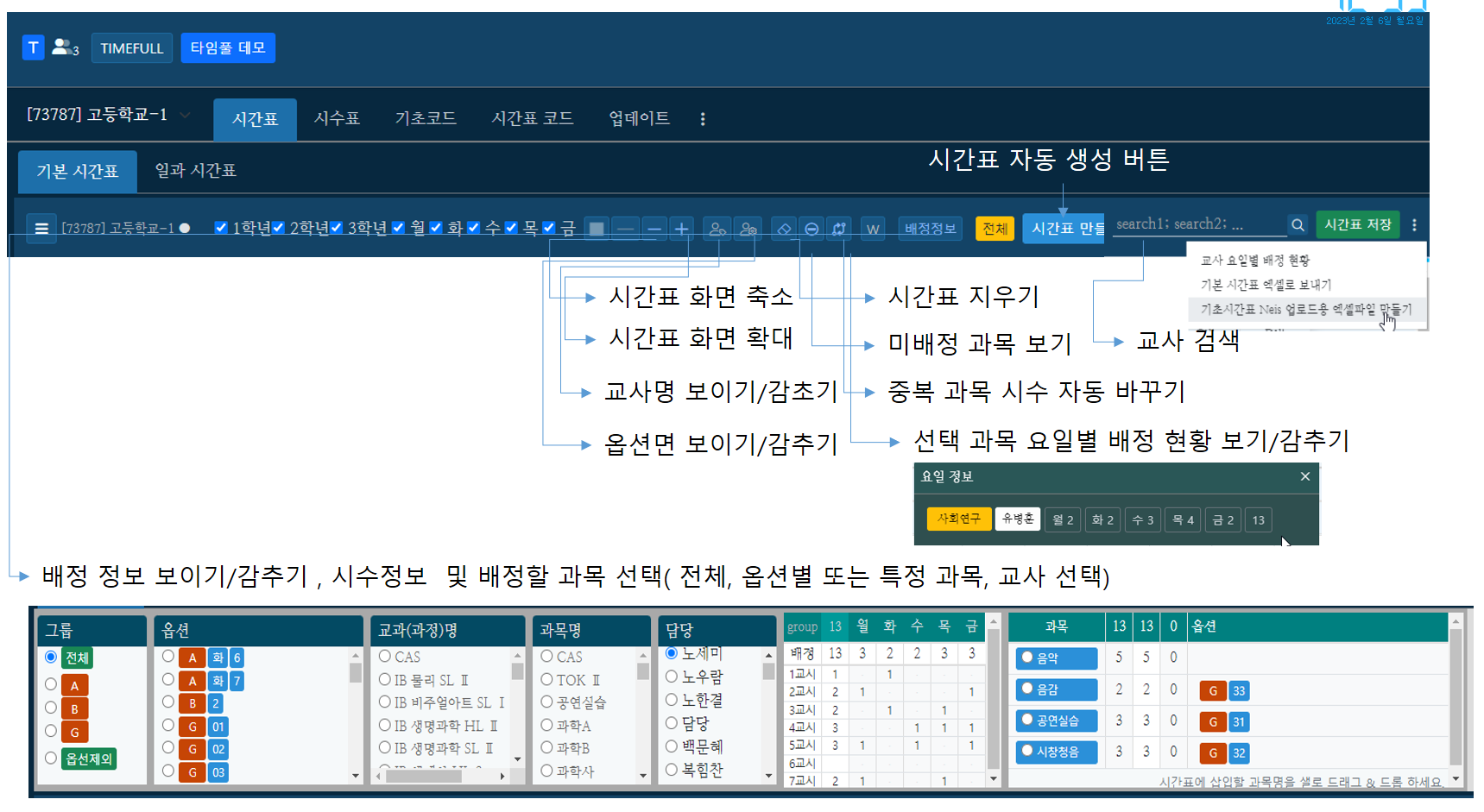 - 다양한 옵션과 확장반 기능( N 플러스 M 반 편성)으로 다양한 선택 과목 편성 시간표 자동 생성